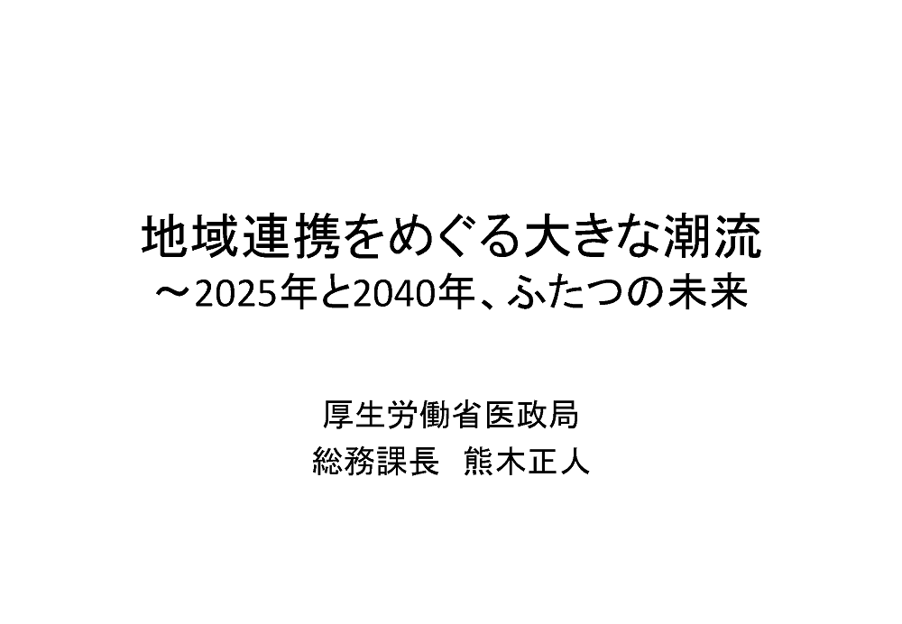 基調講演では厚生労働省医政局総務課長の熊木正人氏よりご講演をいただきました。地域医療構想、地域包括ケア、地域共生社会という大きな政策と、2025年と2040年という未来のマイルストーンを意識した上で、我々連携実務者が個別の事業や施策をどのように捉え、行動していくべきかのヒントを数多く示唆していただけたように思います。熊木氏の語り口は丁寧でわかりやすいだけでなく、連携実務者に対するエールもあり、素晴らしい内容だったと思います。
