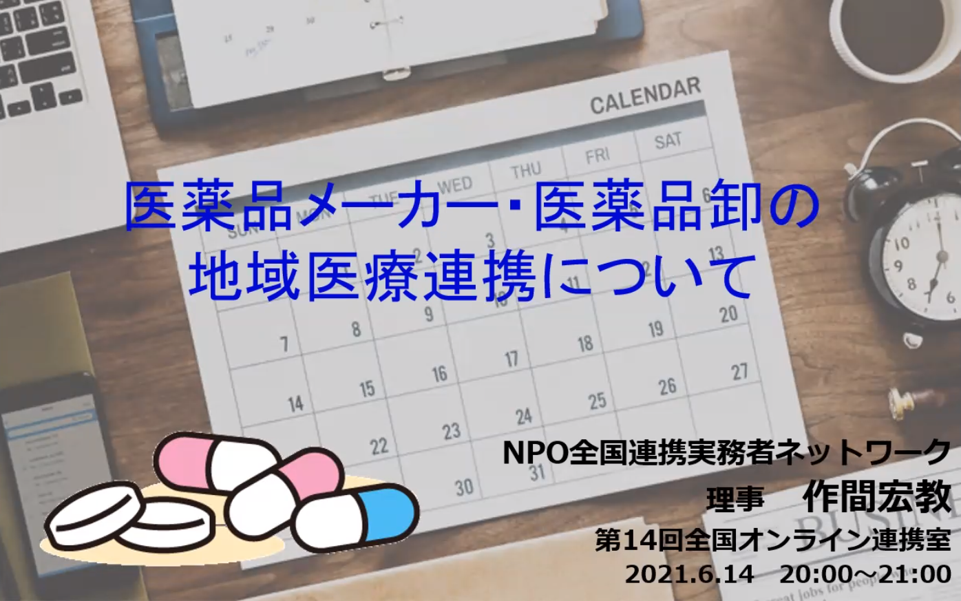毎回連携実務者にとって身近な話題や新しい話題を取り上げている全国オンライン連携室ですが、今回は「医薬品メーカー・医薬品卸の地域医療連携について」と題して、当法人理事の作間 宏教さんから話題提供をいただくこととなりました。