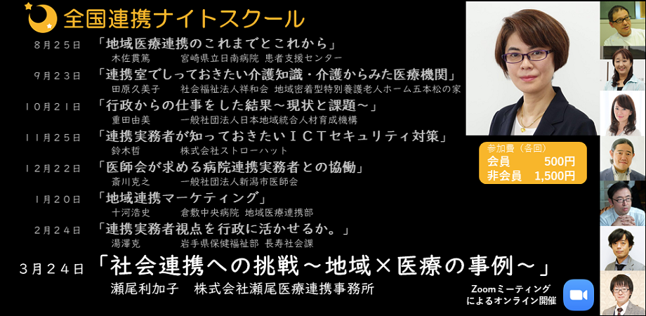 次回、本年度最終回となる第8回全国連携ナイトスクールは、3月24日(水)に「社会連携への挑戦~地域×医療の事例~」と題し、当法人理事の瀬尾利加子(株式会社瀬尾医療連携事務所)が講師を担当します。以下のPeatixのWEBサイトからすでにお申し込みが可能となっております。次回も是非ご参加いただけますよう、お願い申し上げます。