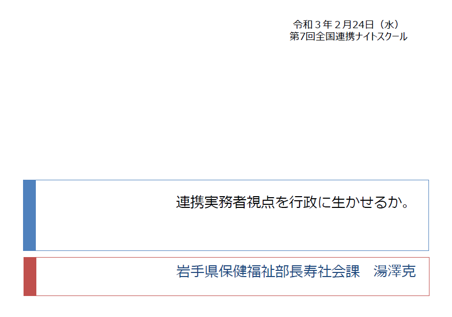 当法人理事で岩手県保健福祉部の湯澤克より「連携実務者視点を行政に活かせるか。」と題した講義を開催いたしました。