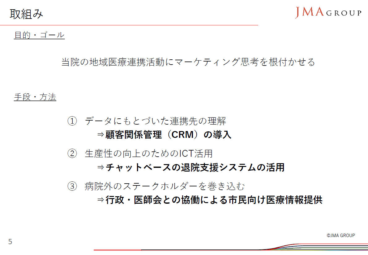 「自院に地域医療連携活動にマーケティングの視点を根付かせる」という目的、ゴールに基づいて導入してきたICTやデータ利活用の実践として取り組んできた、1)顧客関係管理(CRM)の導入、2)チャットベースの退院支援システムの活用、3)行政・医師会との協働による市民向け医療情報提供についての話題を提供いただきました。