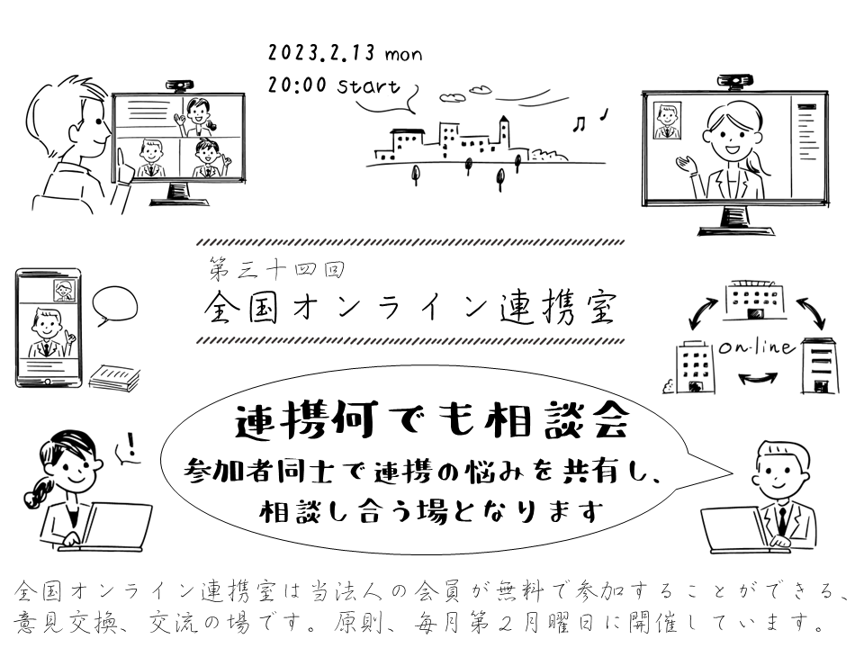来たる2月13日(月)20時より、「第34回全国オンライン連携室」を開催いたします。