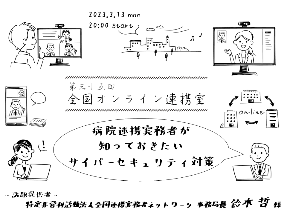 毎回連携実務者にとって身近な話題や新しい話題を取り上げている全国オンライン連携室ですが、今回は「病院連携実務者が知っておきたいサイバーセキュリティ対策」と題して、法人事務局の鈴木からお話いたします。