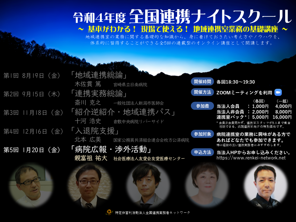 今年のナイトスクールのテーマは「基本がわかる! 現場で使える! 地域連携室業務の基礎講座」となり、地域連携室の業務に関する基礎的な知識から、身に着けておきたい考え方やノウハウを体系的に習得することができる、全5回の連載型オンライン講座として開講します。