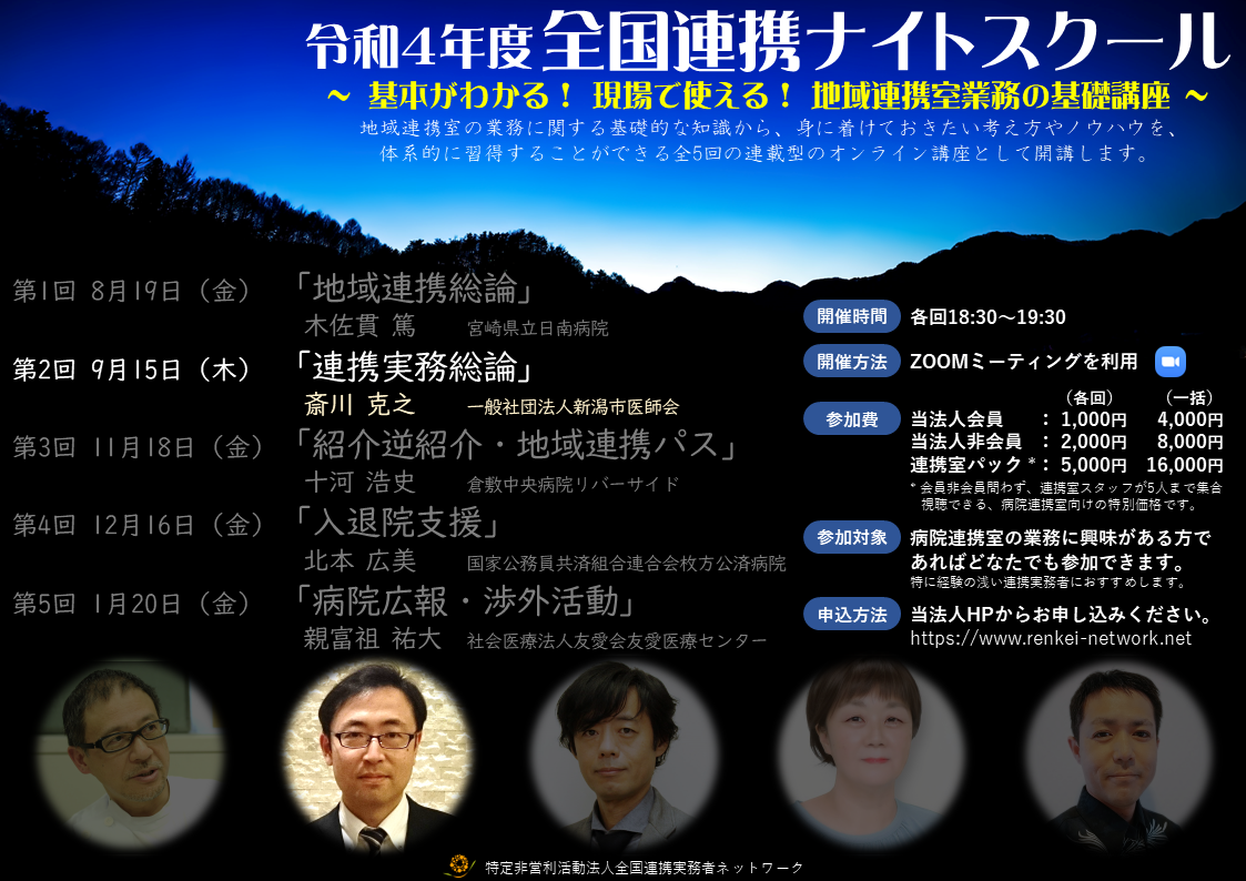 病院連携室の実務者の皆さんはもちろん、多くの連携実務者の皆さんにご参加いただけることを楽しみにしております。なお「全国オンライン連携室」は当法人会員向けの学習・交流の場となります。会員ならだれでも無料で参加いただけます。ぜひこれを機にご入会もご検討いただければ幸いです。