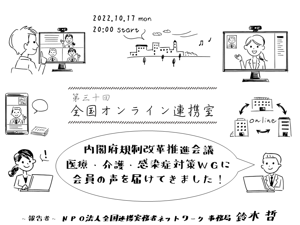 毎回連携実務者にとって身近な話題や新しい話題を取り上げている全国オンライン連携室ですが、今回は「内閣府規制改革推進会議 医療・介護・感染症対策WGに会員の声を届けてきました!」と題して事務局からの話題提供の時間にしたいと思います。