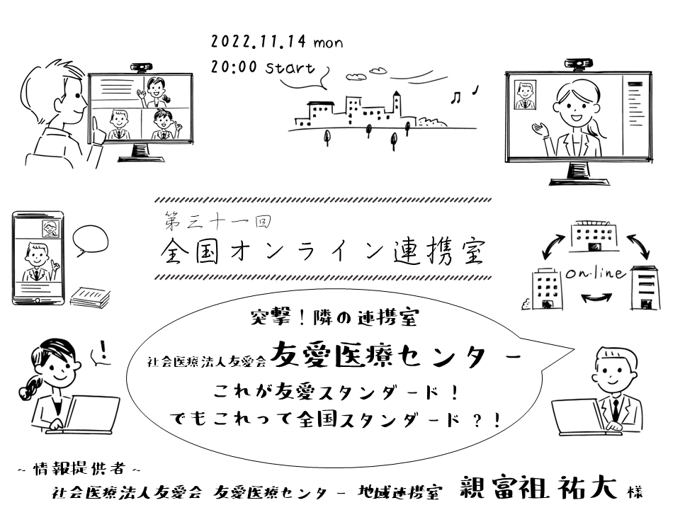 毎回連携実務者にとって身近な話題や新しい話題を取り上げている全国オンライン連携室ですが、今回はシリーズ「突撃!隣の連携室」の開催です! 第2回目は、当法人理事で社会医療法人友愛会 友愛医療センター地域連携室の親富祖祐大氏から、「これが友愛スタンダード! でもこれって全国スタンダード?!」と題して話題提供をいただきます。