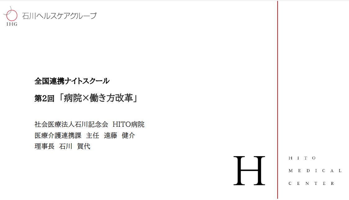第2回はHITO病院理事長・石川賀代先生、同 地域医療介護連携課・遠藤健介氏から、『病院×働き方改革』をテーマにご講義いただきました。
